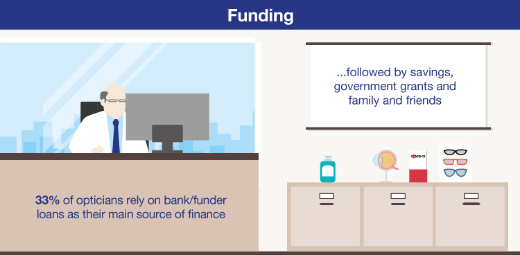 While opticians are looking to the government for assistance, bank / funder loans are the main source of finance for 33% of opticians, followed by savings (25%) and government grants and family and friends (both 22%).