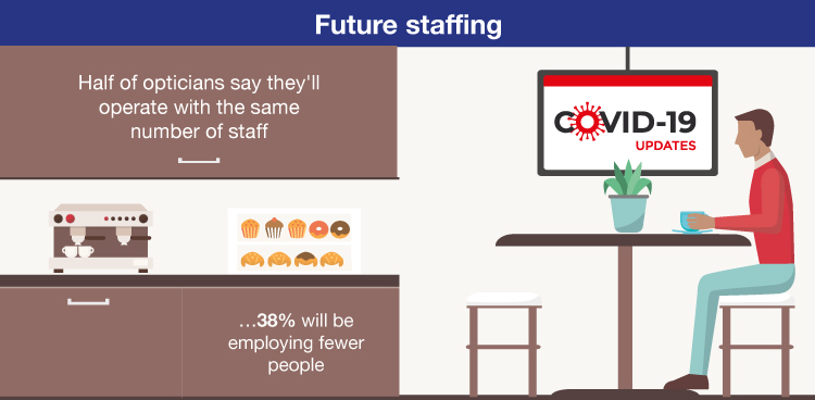 In terms of future staffing, will your business operate with more or less staff?Half of opticians say they will operate with the same number of staff when business returns to normal, contrasting with the 38% who will be employing fewer people. A sizeable minority (12%) will be hiring more staff.