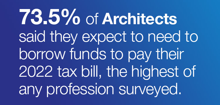 Tax bills can be, for many firms, difficult to afford –73.5% of Architects said they expect to need to borrow funds to pay their 2022 tax bill, the highest of any profession surveyed.