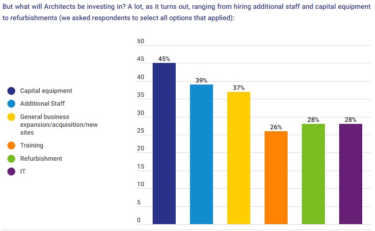 Despite the skills shortage being felt in many sectors, Architects are bullish about their investment plans, with a strong response to our question ‘are you considering investing in your business in the next 12 months’ – 79% answered ‘yes’.